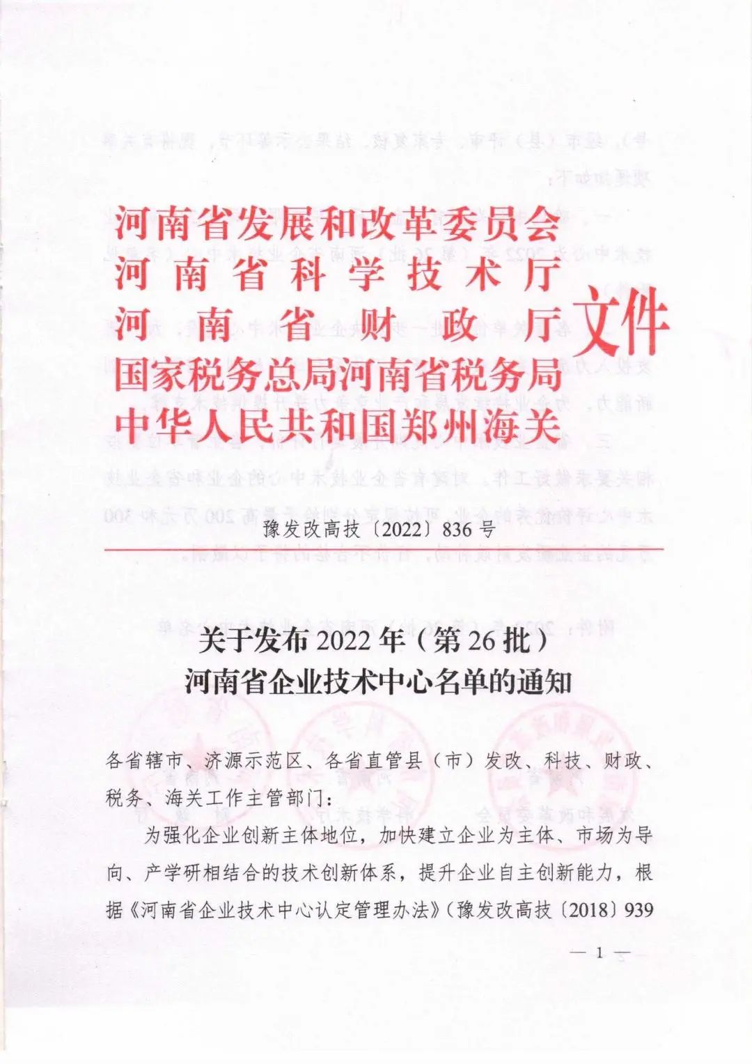 近日,河南省發(fā)改委、科技廳等五個權(quán)威部門聯(lián)合發(fā)文,公司企業(yè)技術(shù)中心獲批為 河南省企業(yè)技術(shù)中心,是繼2021年度獲批信陽市施工技術(shù)工程